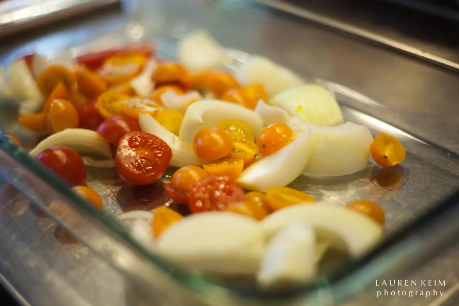 Any tomatoes you have on hand, roughly chopped (I halved a handful or two of red & yellow cherrys)