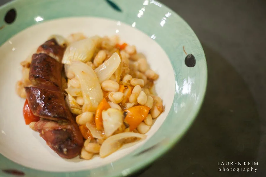 IF you're doing this in the oven, put all the ingredients (except the vinegar) into a baking dish at once. Instead of slicing the sausage into rounds, make some slashes into each link and place on top of the beans. Pop the dish into a 375º oven for 30-45 minutes. This is a very forgiving meal (When we made it the night I took these photos, Cal & Neel were over half an hour late from school and dinner sat just fine. All was well.), so you can fudge on the longer end if you need. When ready, add a splash or two of vinegar and stir and serve.